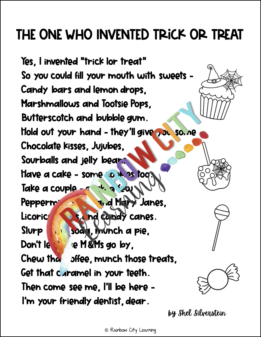 Here's a funny and fun poem for Halloween from Shel Silverstein's book, Every Thing On It. The cute graphics on this page are from the amazing Glitter Meets Glue. You're welcome again!
