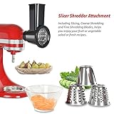 Fits kitchenaid mixer design the slicer shredder attachments are compatible with all kitchenaid stand mixers Made by durable food grade material providing a healthy and quick way to slice or shred fresh ingredients Package includes white housing slicing blade coarse shredding blade medium shredding blade fine shredding blade and user manual Maintenance and cleaning the slicer shredder attachments for kitchenaid stand mixer is easy to setup and clean Simply attach it to the power hub of any kitchenaid stand mixer less effort than manual graters We suggest washing the parts with brush or soft cloth then dry them thoroughly to keep them in peak condition The blades are top rack dishwasher safe and the rest is not