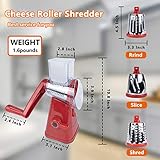 EVOSUMMER - multiple functions hard cheese slicer hand crank cheese grater is great for cheese vegetables potatoes nuts onions for coleslaw hash browns salad pizza toppings and more with this handpowered rotary grater humanity design cheese shredder grater a strong suction base grips securely to clean and smooth countertop for effortless chopping The mandoline slicer sits diagonally so the grated pieces fall out from the vegetable grater shredder by themselves and make no clogging 3 round sharp blades include a slicing blade a coarse shredding blade and a fine shredding blade mamual and high efficiently nut chopper with this round cheese grater you can get food preparation more efficiently with minimum effort 360 degree roller cuts foods all the time when you crank the handle Shaking 1 circle equals to cut 12 times