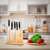 Responsibly sourced sustainable bamboo eco friendly natural sturdy wood sleek durable hygienic well made and each piece is unique Double sided minimal slim design strong magnetic strips enclosed in a stylish bamboo block freestanding without needing to mount to a wall rack display 10 12 small and large knives on your kitchen cabinet or counter