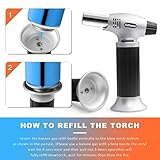 Easy to use and portable refill the kitchen torch with butane and simply press the button turn flame knob until you hear the gas flow and press on ignition button This butane torch is small and lightweight easy to hold Versatile of applicationsthe strength of the flame max 2500 is adjustable so that you can customize it according to the intended applications such as cooking baking soldering diy jewelry barbecuing or camping