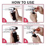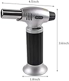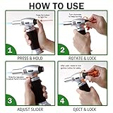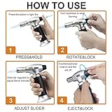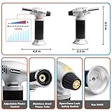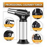 Light up with piezo ignition technology just press to light fire easy to operate with the gas flow regulator and air flow control valve cooking torch can be flame intensity controlled release the button the flame goes off Safety durable blow torch security lock design prevents against accidental ignition and a wide base helps to prevent the culinary torch from tipping made with aluminum alloy body for long lasting use