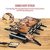 Healthy cooking and easy cleanup the raclette indoor grill has 8 individual grill pans for raclette cheese cooking sides and sauces It is also suitable for keeping food warm Nonstick coating of the top plate and pans for healthier cooking with no need for butters or oils Nonstick coating makes it easier to handle food removal and cleaning 2 in 1 reversible grill plate the electric grill provides uniform heat and comes with a grooved and flat surface for versatile cooking options The grooved side allows you grill desired food shade and removes frying fat easily Flat cooking surface is perfect for creating delicious crepes which makes it versatile for cooking morning breakfast such as pancakes and eggs 2 in 1 electric grill saves your trouble to pull out another equipment