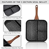 ESLITE LIFE - Ergonomic bakelite handle the heat resistant bakelite handle are suitable for grasping and staying cooling while cooking Suitable handle lengths and curved radians which is able to help you master your cooking There are no rivets from the inside ensuring easy cleanup as well Multisection design the 3 divided section skillet allows you to cook 3 different food simultaneously The allinone frying pan prevents you from having to use multiple pans The compartments are separate enough to prevent the foods from mixing which helps you saves you time and energy to cook a breakfast and elaborate lunch in just one pan for you and your family with little cleaning